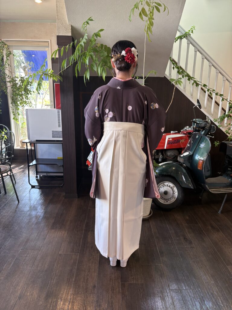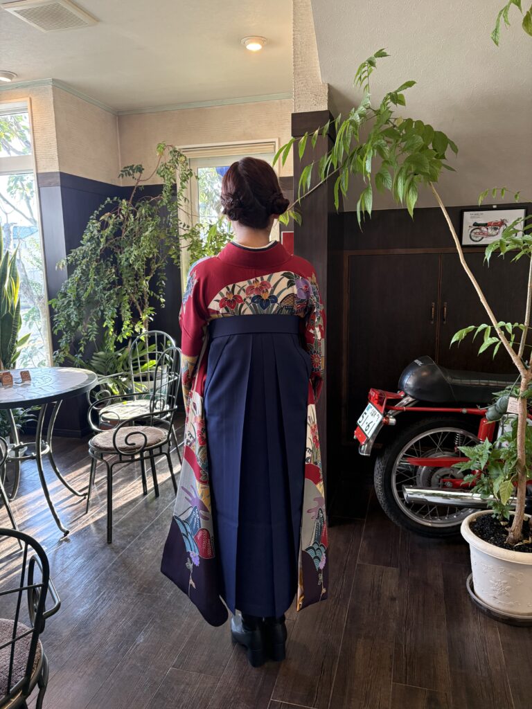 先日に続き 「卒業おめでとう!!」です。サロンの近くに久留米大学の卒業式が先日あり お二人の袴の着付けをさせていただきました。お一人目はお母様の振袖に袴を合わせてのお支度。お母様は卒業式で袴を着ていないということで その思いと共に・・・☆*:.。. o(≧▽≦)o .。.:*☆。帯は敢えて無地の濃紺を合わせました。やはり振袖と合わせると豪華です!